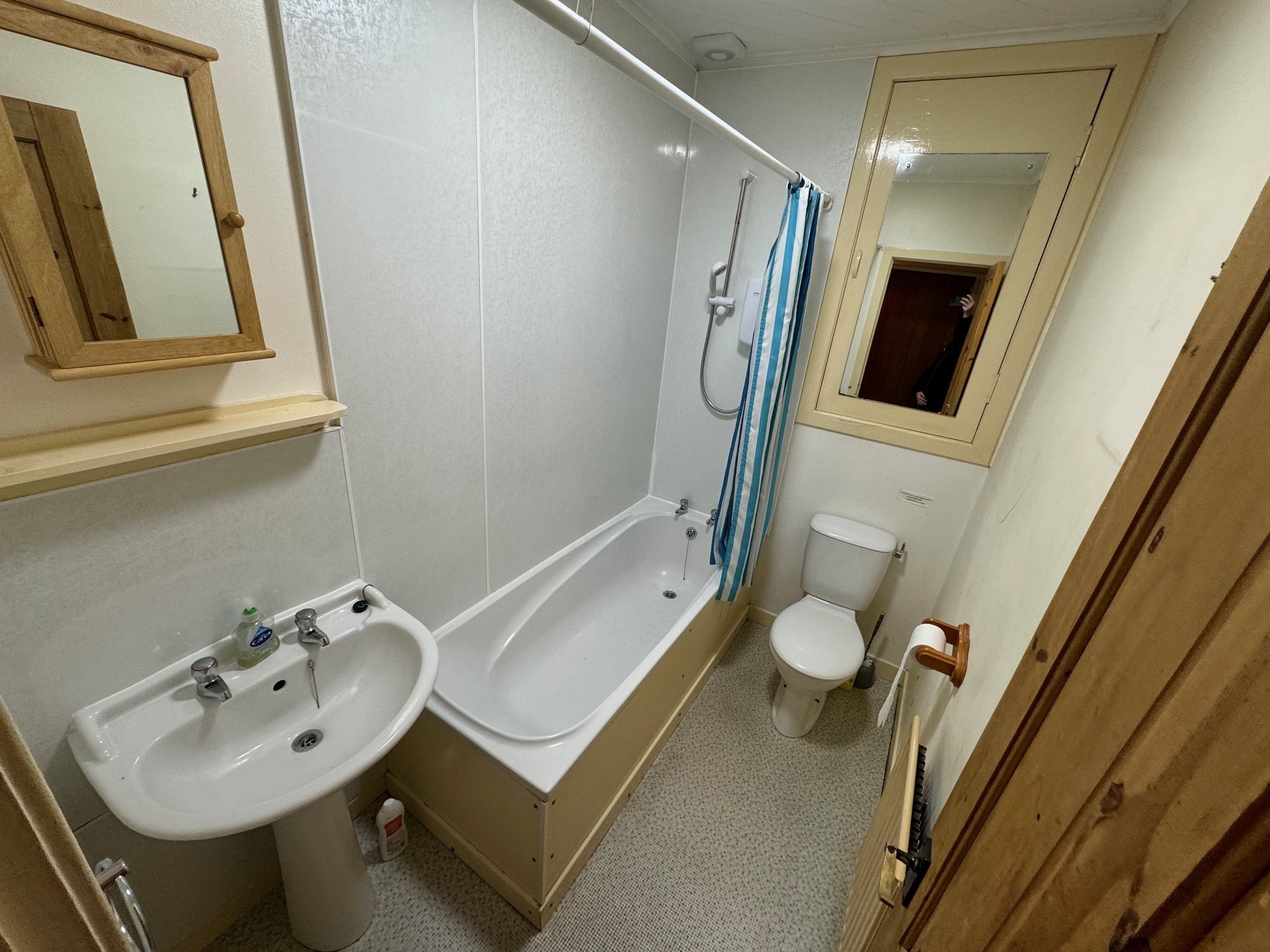 Bathroom: White suite. Aqua panels fitted, over-bath electric shower, shower rail and curtain, extractor fan, medicine cabinet and vinyl flooring. Large storage cupboard.