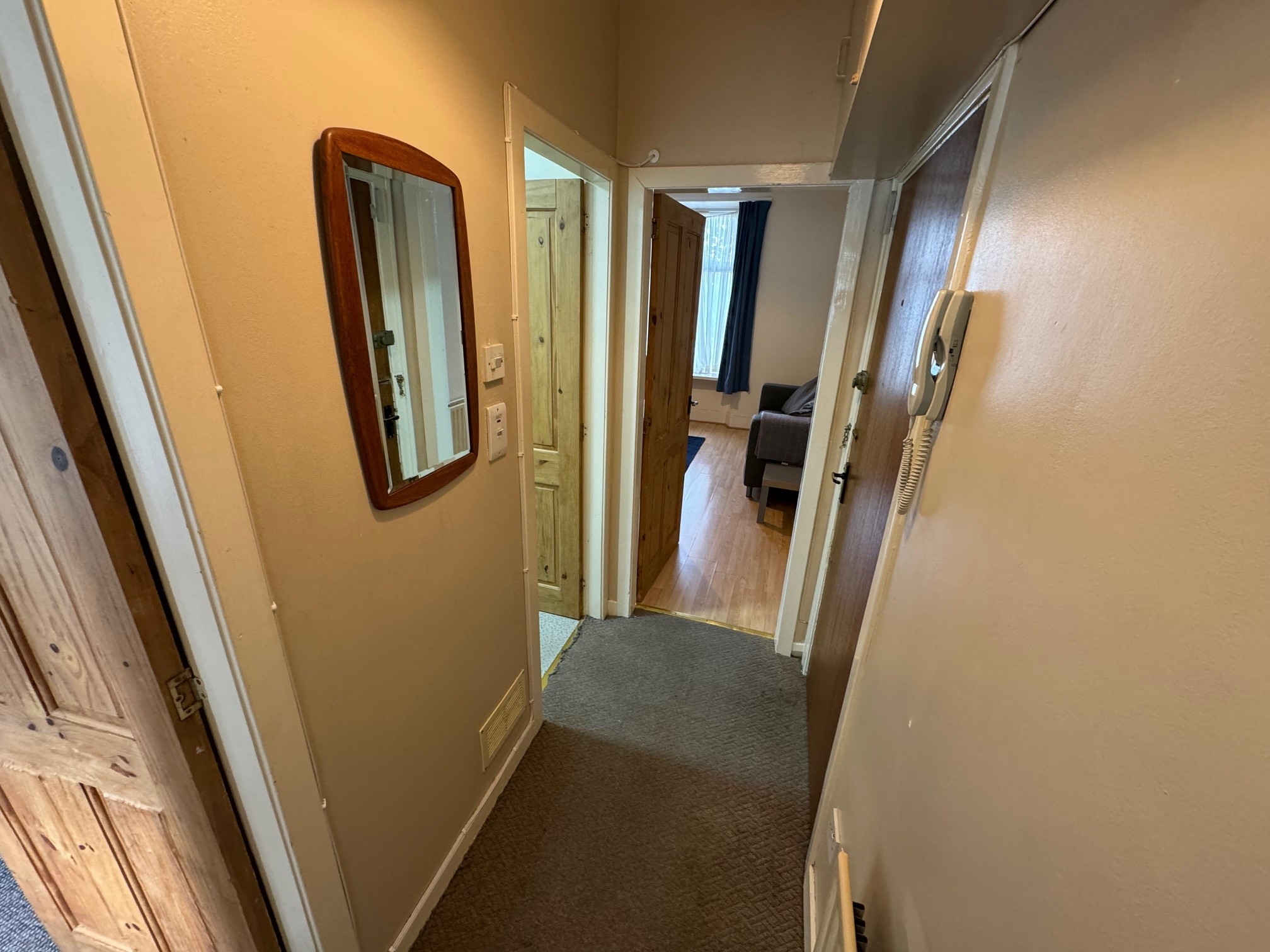 Hallway: Hallway with fitted carpet, high level storage cupboard and meter cupboard.